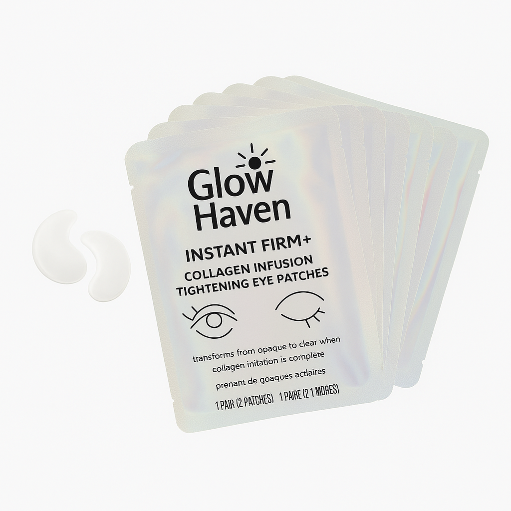 See your eyes transform in 60 minutes with Glow Haven InstantFirm Eye Patches. Powered by our Marine-Peptide Complex, they depuff, tighten, and smooth for lasting hydration and radiance. Skip the weak creams — get professional results at home. From the first use, your eyes look smoother, brighter, and more youthful.